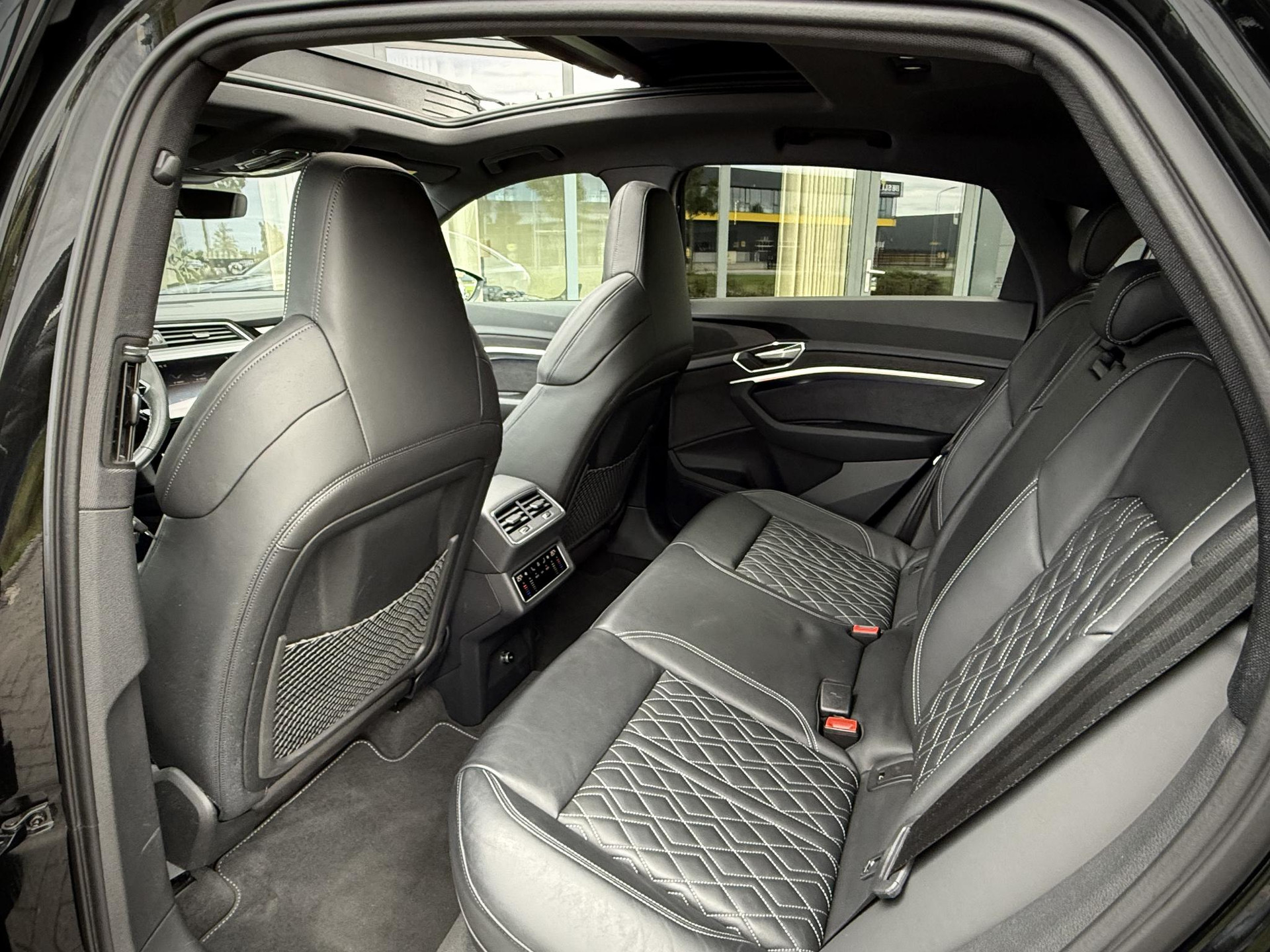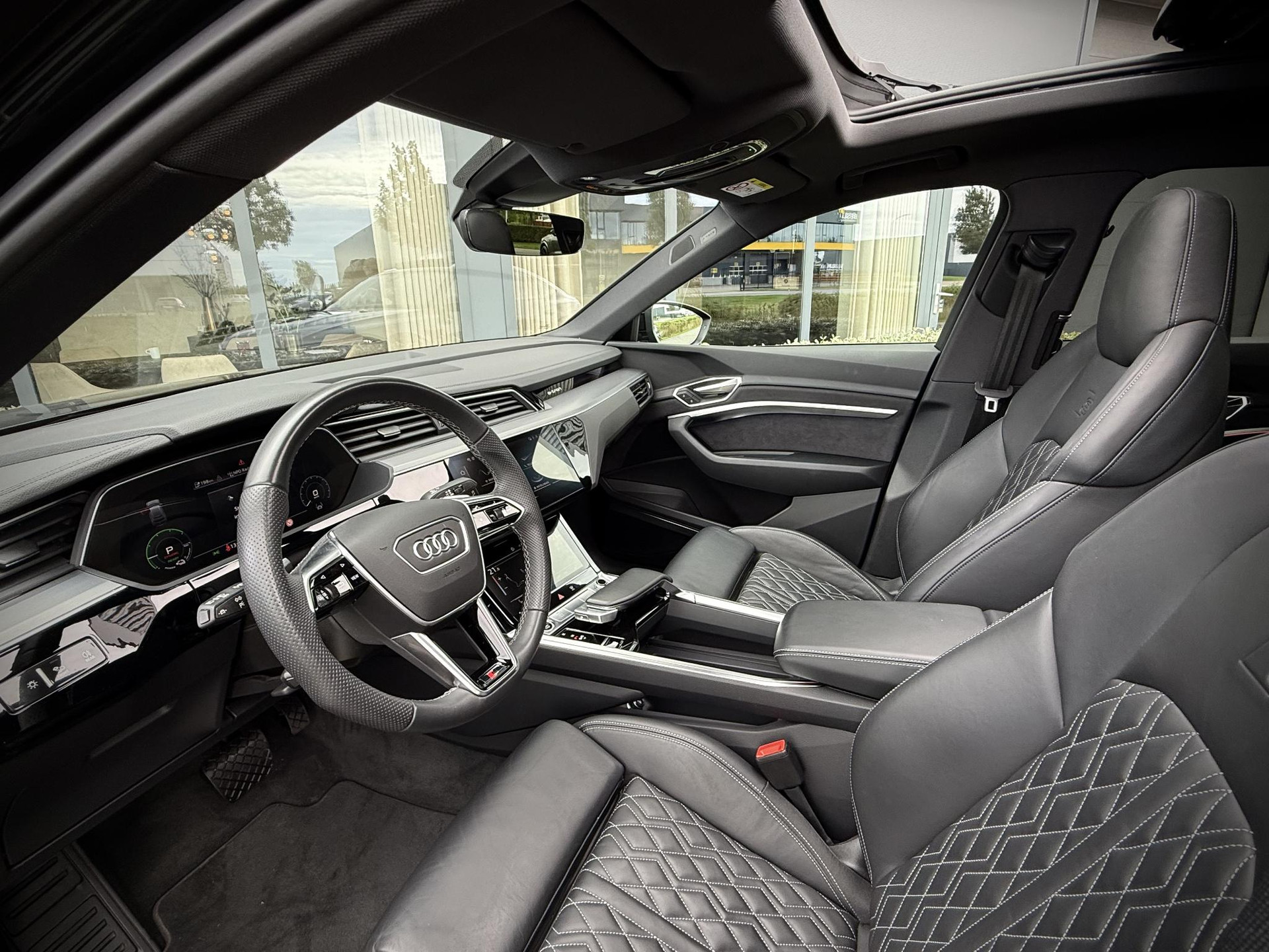 Alleen deze week *** van EUR 45.950,- voor EUR 44.950,- *** In nieuwstaat verkerende en van eerste eigenaar afkomstig, dealer onderhouden en schadevrije Audi E-Tron Sportback 50 Quattro Deze uitvoering is voorzien van S line interieur, S line exterieur pakket, hoogglans zwart exterieur pakket, RS Zetels met gestikt soft lederen bekleding, panoramadak, 21 inch hoogglans zwarte en originele S line velgen, privacy glas origineel af fabriek, LED verlichting voor en achter, Quattro vierwiel aandrijving, ACC radar cruise control, Luchtvering (hoogte instelbaar), Sfeerverlichting (kleur instelbaar), elec. verstelbare stoelen met geheugen, Head Up display, elec. achterklep, key less entry & go, Premium Audio/ Bang & Olufsen, 3 spaaks S line stuurwiel, 4 zone airco met climate control voor en achter incl. display voor achterbank, dode hoek systeem, uitstaphulp, Stoelverwarming, 360 graden camera met topview functie parkeer camera voor, achter en zijkant, stoelverwarming, draadloze telefoonlader, verkeersbordherkenning, etc. TOPSTAAT met slechts 19.710 km !!!!, 75% wegenbelasting korting, lage bijtelling voor ondernemer, prijs is rijklaar incl BTW en 1 jaar algehele garantie. Audi Accu garantie t/m 10-2030!