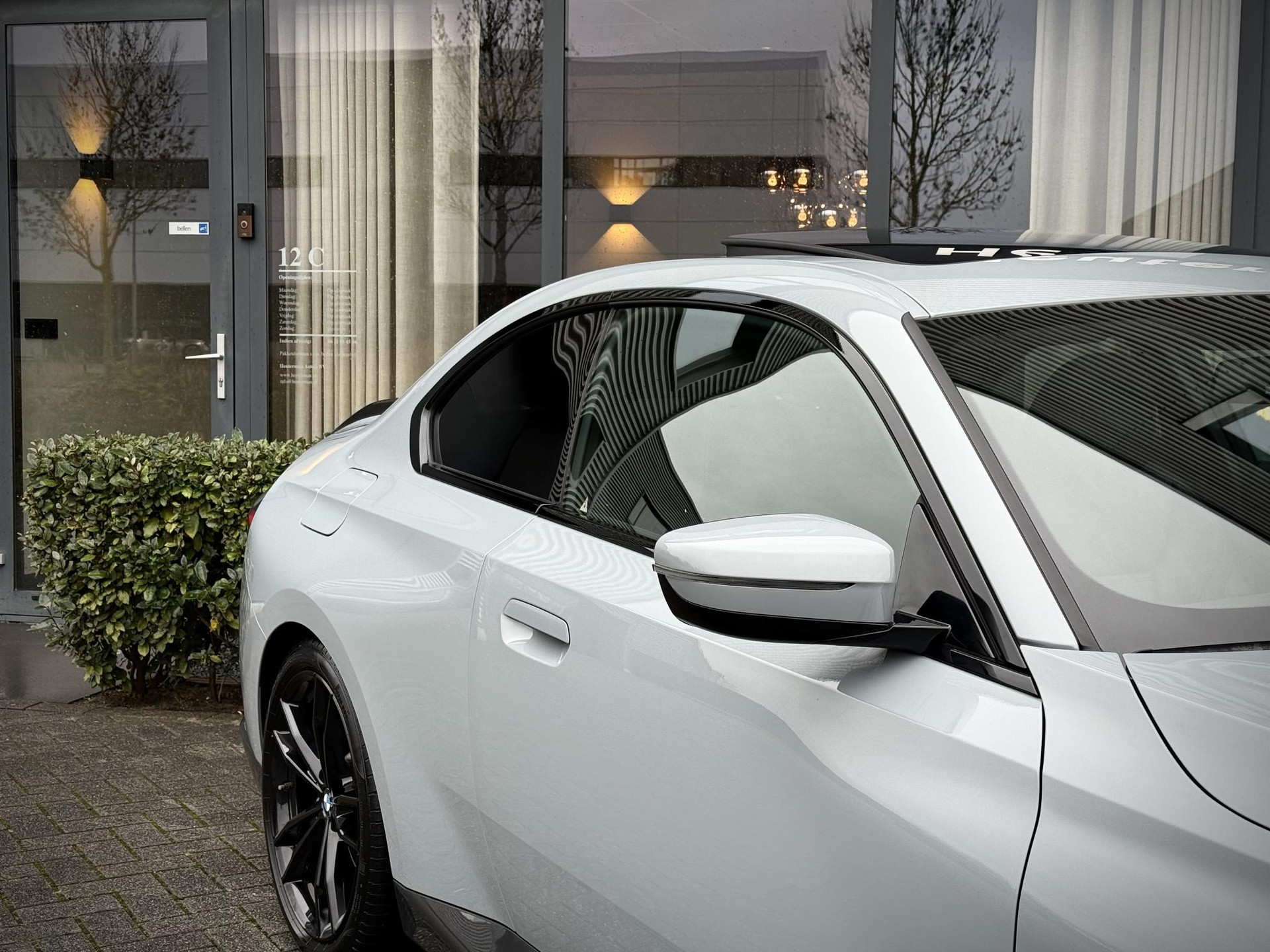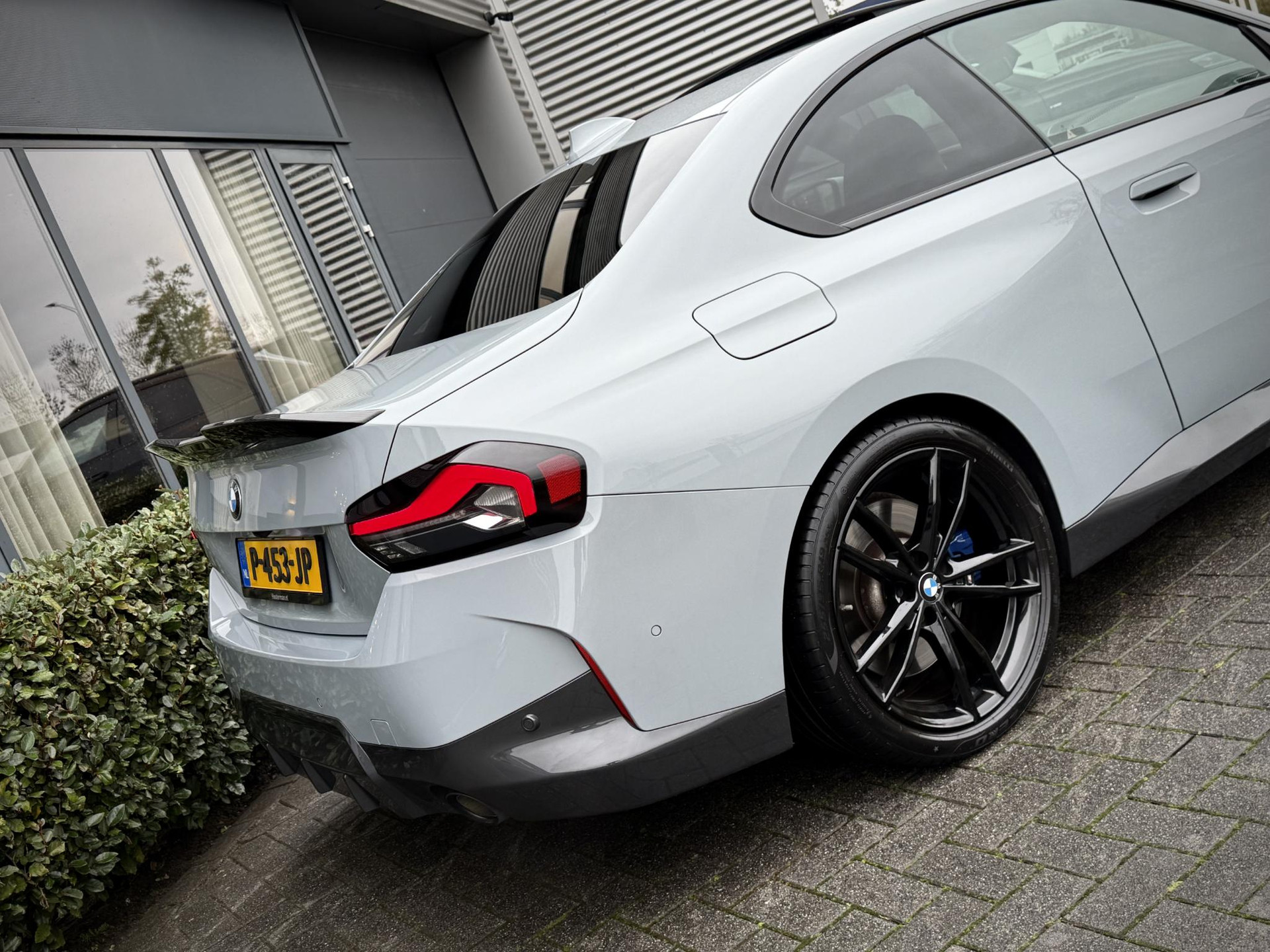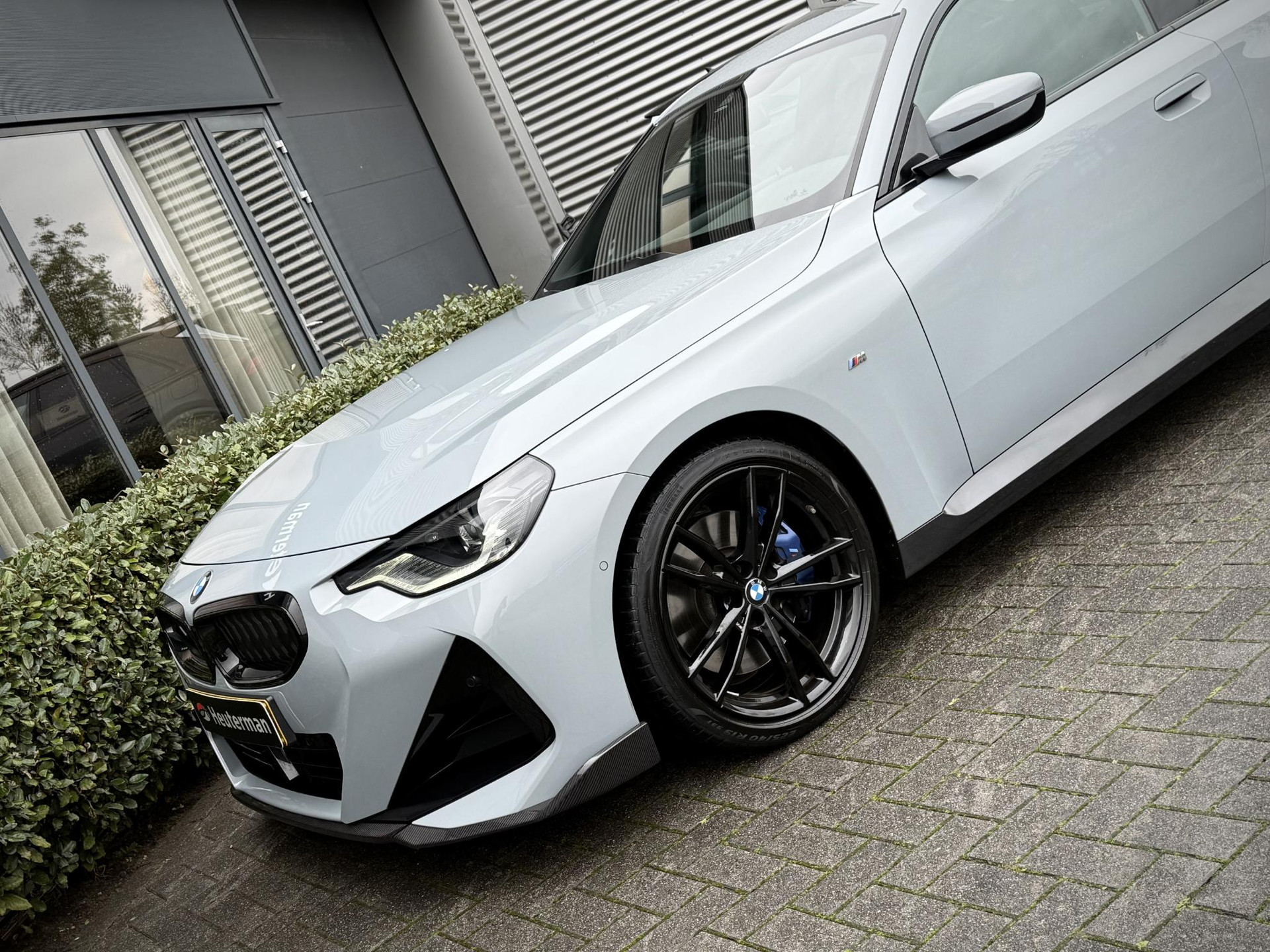 Origineel Nederlands geleverde en van eerste eigenaar afkomstige BMW 2-serie Coupé 220i in M-Sport uitvoering. Auto verkeert in zeer nette staat, is volledig BMW dealer onderhouden en nooit in gerookt. Sportief samengesteld in de kleur Brooklyn grau; voorzien van een M-Sport interieur en - exterieur, hoogglans zwarte exterieur optiek (Shadow Line) en diverse originele M-Performance parts w.o. carbon achterspoiler, carbon front lip etc. Verder voorzien van o.a. elektr. glazen schuif-/ kanteldak, lederen interieur, virtual cockpit, sfeerverlichting, 19" hoogglans zwarte lichtmetalen M Sport velgen, LED koplampen, LED achterlichten, parkeersensoren voor + achter incl. parkeercamera, stoelverwarming voor + stuurwielverwarming, Apple Carplay, privacy glas origineel af fabriek, etc. Topstaat!
